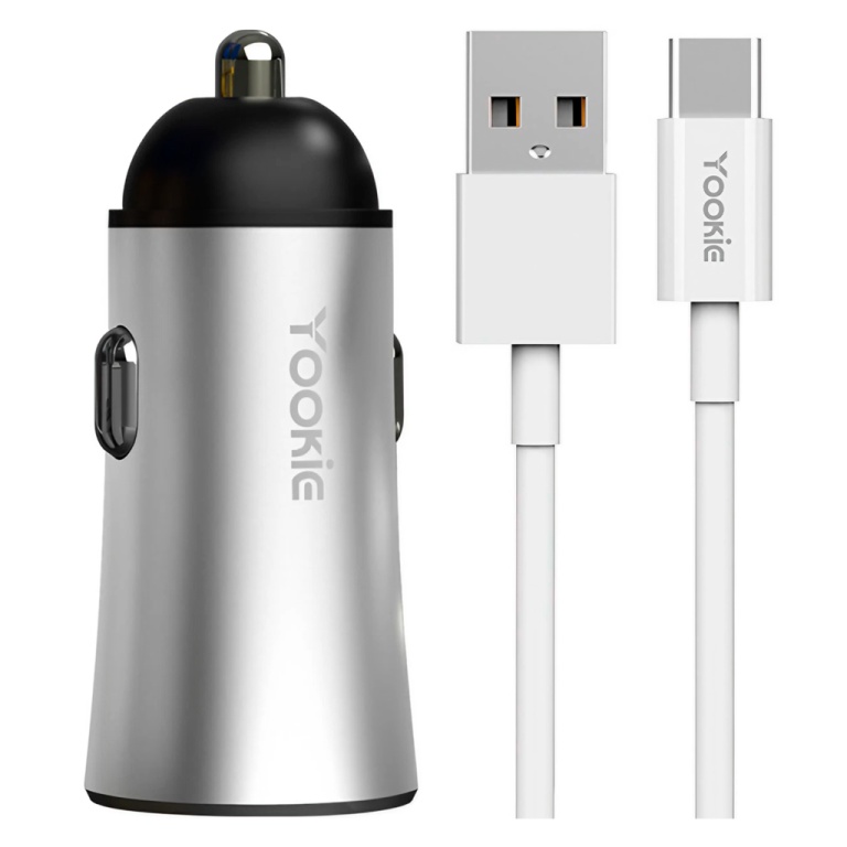 carregador veicular yookie pc1 12w dual port usb + type-c - cinza
