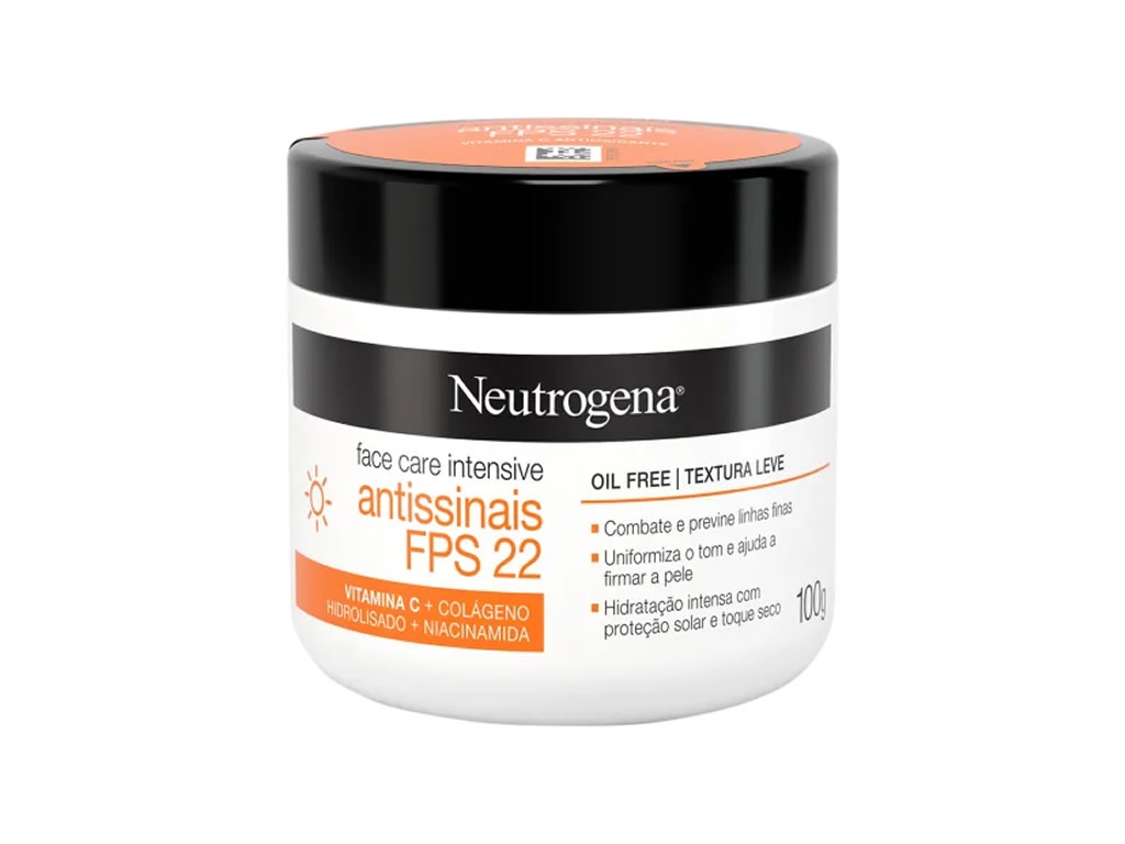Anti-idade para todos os tipos de pele. Com textura leve e oil-free, Neutrogena Face Care Intensive Antissinais FPS22 protege, uniformiza e previne linhas finas.