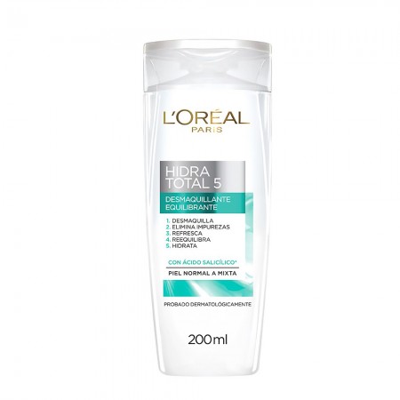 | Desmaquilhante desmaquilhante Hydra total 5. O desmaquilhante hidrata, refresca, remove as impurezas e reequilibra o rosto e os olhos. Ideal para pessoas com pele normal a mista. |