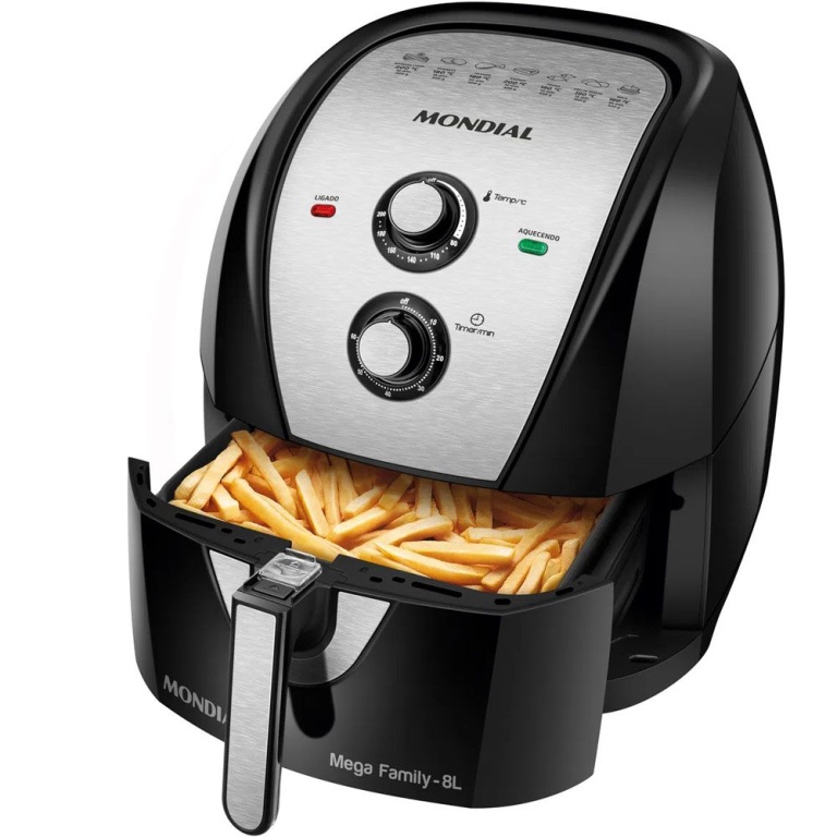 | Características Cesta antiaderente e fácil de limpar - Aviso sonoro e desligamento automático - Controle de temperatura e temporizador |