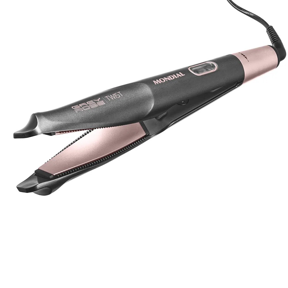 | A chapinha bivolt Mondial Grey Rose Twist 2 IN 1: alisa e cacheia os cabelos deslizando-os pelas placas de cerâmica flutuantes e torcidas. |
