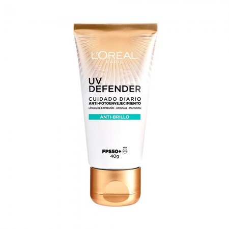 | O protetor solar UV Defender SPF50+ da L'Oreal Paris, com textura leve e de rápida absorção, é ideal para ser incorporado à sua rotina diária de cuidados faciais. |