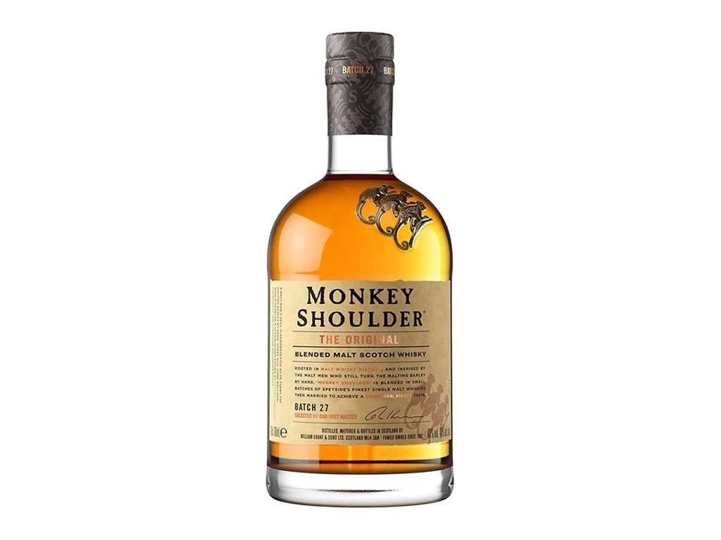 O Monkey Shoulder é um whisky escocês triplo malte desenvolvido por David Stewart, o destilador mestre da William Grant. A primeira coisa a ser notada é a garrafa, com formato semelhante àquela bem característica da Balvenie, mas com três macacos subindo um no ombro do outro.