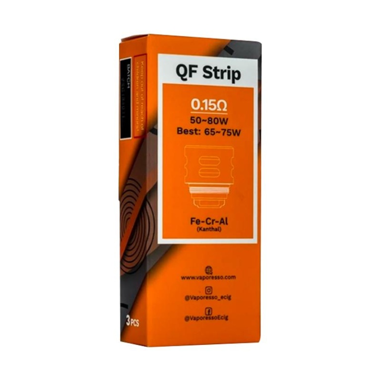 As bobinas de substituição Vaporesso QF usam a combinação de materiais de algodão e linho para obter um desempenho duradouro, porém aprimorado pelo sabor, com as seguintes opções de bobina: 0.15ohm QF Strip. É introduzido com o tanque SKRR Sub-Ohm e é compatível com as bobinas Vaporesso GT, mas não se encaixa em tanques pequenos, como o Cascade Baby ou vidro de diâmetro menor.