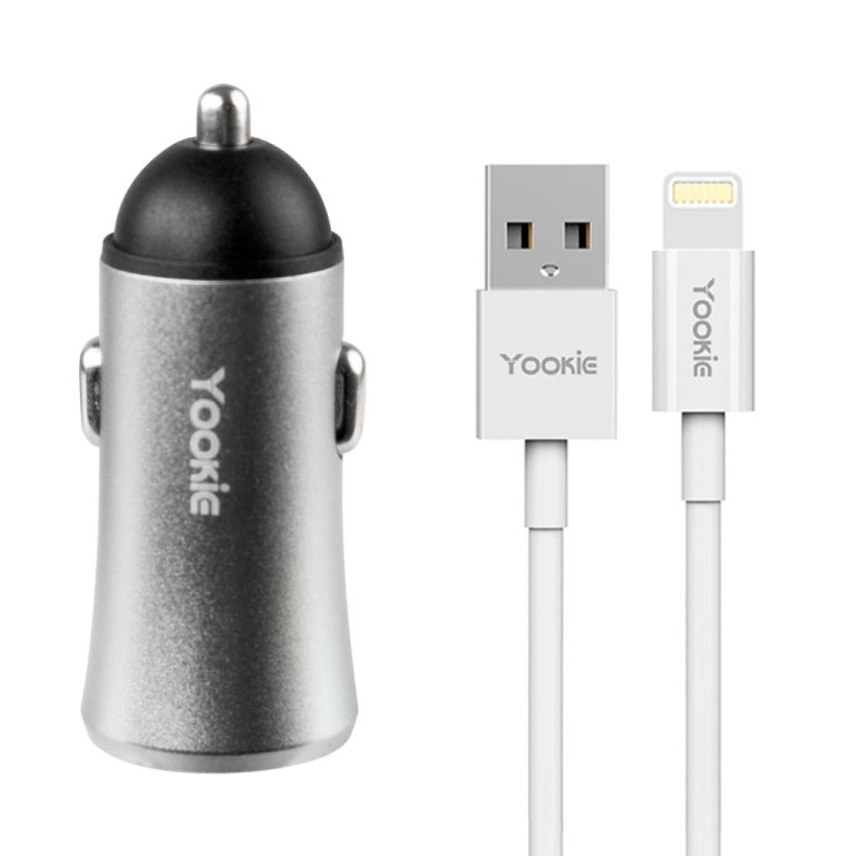 carregador veicular yookie pc1 - 2x usb - com cabo usb lightning - 2.4a - prata