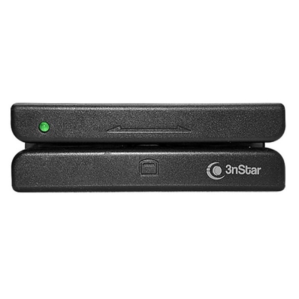 | O leitor de cartão magnético de três trilhas pode ser usado para passar e ler a tarja magnética no verso de um cartão de crédito ou débito ou outro cartão com tarja magnética. |