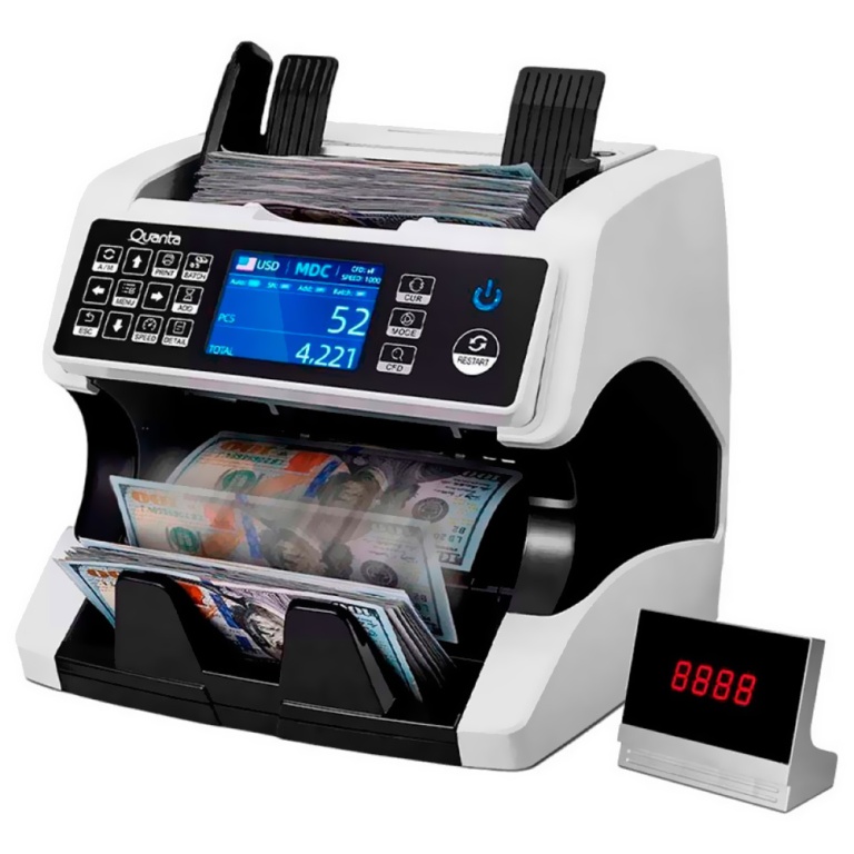 | Características Detecção de notas falsas: magnética, infravermelha, ultravioleta - Detecção de erros: notas duplas, notas brancas, notas vinculadas - Função de detecção automática de moedas, valores, quantias e soma total - Função de memória |